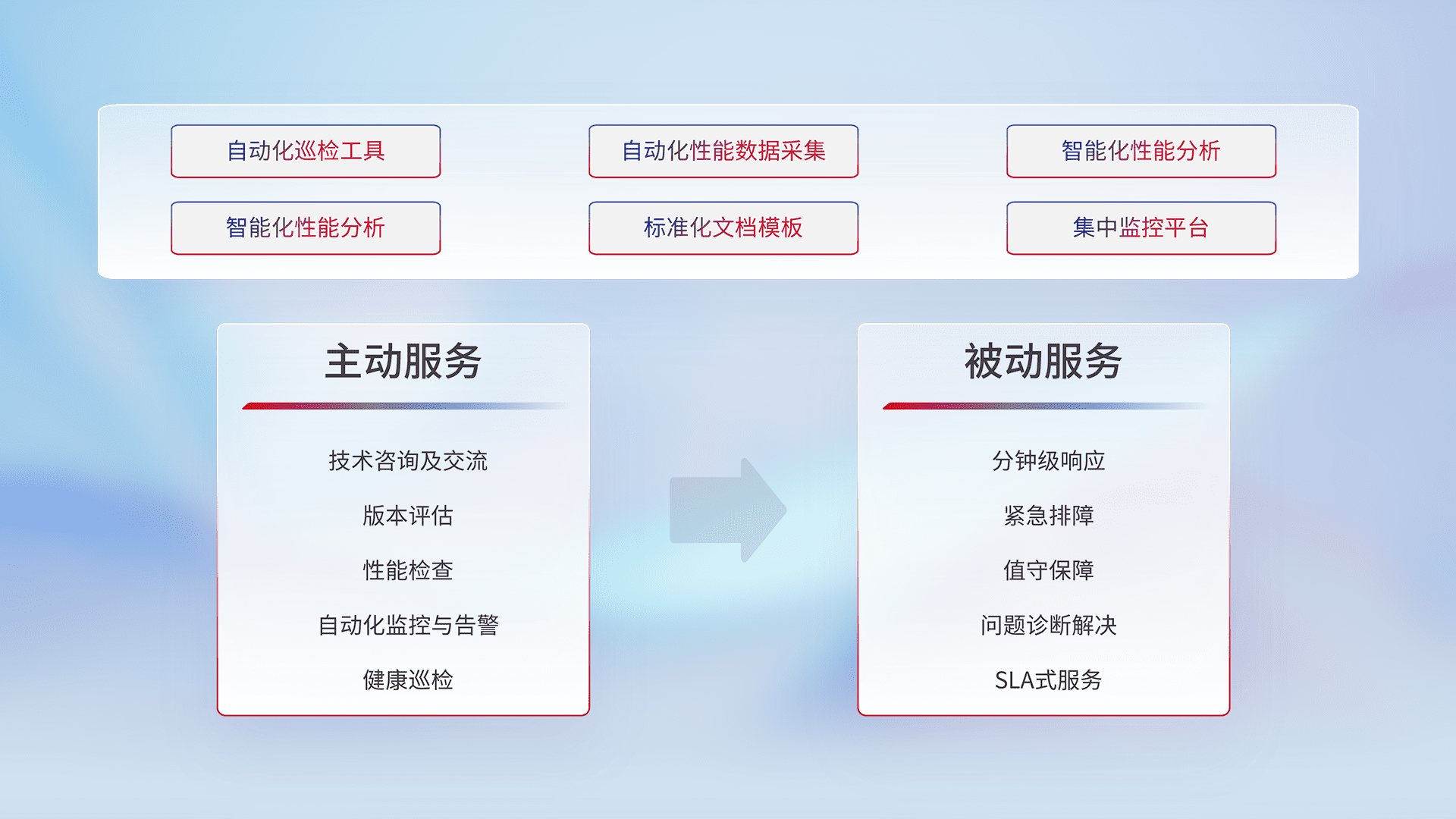 智能化工具和标准化文档,,,,保障服务质量,,提供主动服务(包含技术咨询、、、、版本评估、、、、性能检查、、、自动化监控与告警、、、健康巡检)和被动服务包含(分钟级响应、、、紧急排障、、值守保障、、、问题诊断解决、、SLA服务)。。。